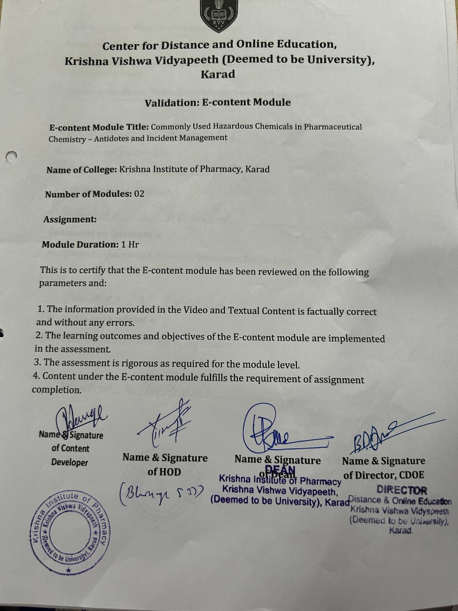 This certificate confirms successful completion and validation of the first phase of the e-content module on hazardous chemicals and accidental management.